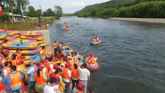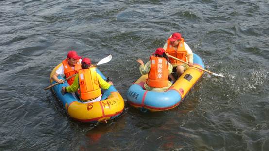 聚集在獵民部落碼頭的員工們?nèi)宄扇旱赜懻撝酉聛?lái)的游戲項(xiàng)目——水上漂流。大家兩兩一組分別登上了皮劃艇。順著水流一路搖晃,行進(jìn)漂遠(yuǎn),不時(shí)還有擱淺觸石事件,但員工的激情已被點(diǎn)燃,沒(méi)有什么能夠阻擋,氣氛十分熱烈。