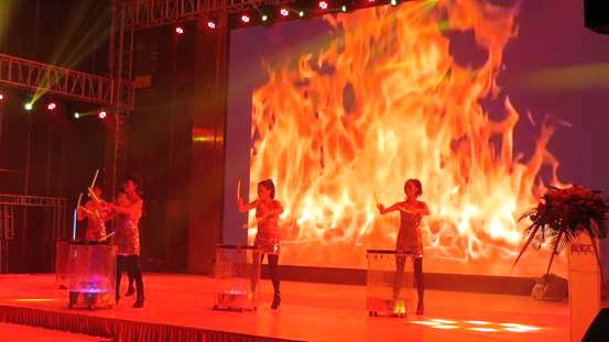年會開始在下午2點整,隨著陳總簡潔的開幕詞,《中國龍》水鼓舞點燃了現場火烈的氣氛,那激情四射的水花隨著燈光變換出五顏六色的光,動感的節奏,成為晚會一個紅紅火火的開始。