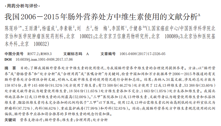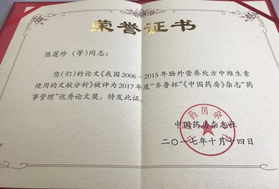 由中國醫學科學院腫瘤醫院陳蓮珍主任藥師執筆,北京協和醫院基本外科于健春教授為通訊作者的學術論文——《我國2006-2015年腸外營養處方中維生素使用的文獻分析》發表在《中國藥房》雜志2017年第28卷第17期上。2017年10月14日,此文章被評為2017年度“齊魯杯”《中國藥房》雜志藥事管理優秀論文獎。